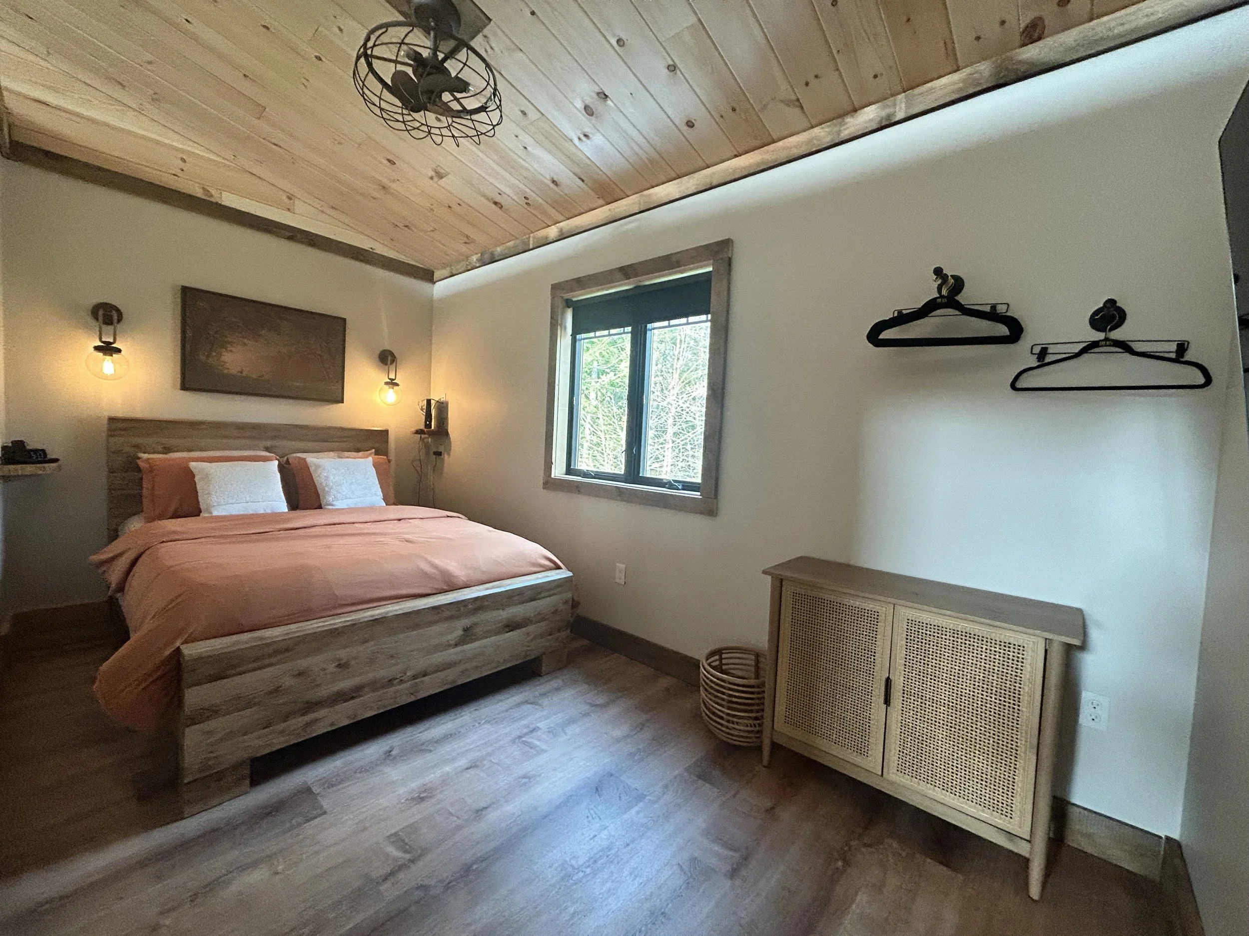 This 650 sq ft guest house features one bedroom, a full kitchen, a gas fireplace, a pull-out couch, and a full bathroom with a tub/shower and washer/dryer. It connects to the main house by a 50-foot covered catwalk, providing excellent privacy even when the main house is occupied. You’ll have dedicated parking and access to all on-property amenities, including two fire pits and a shared hot tub. The cottage and main house can be rented together for larger groups; while we generally avoid booking them to different parties, this may occasionally occur during peak summer dates. With 23 acres to explore, guests consistently find plenty of space to relax.